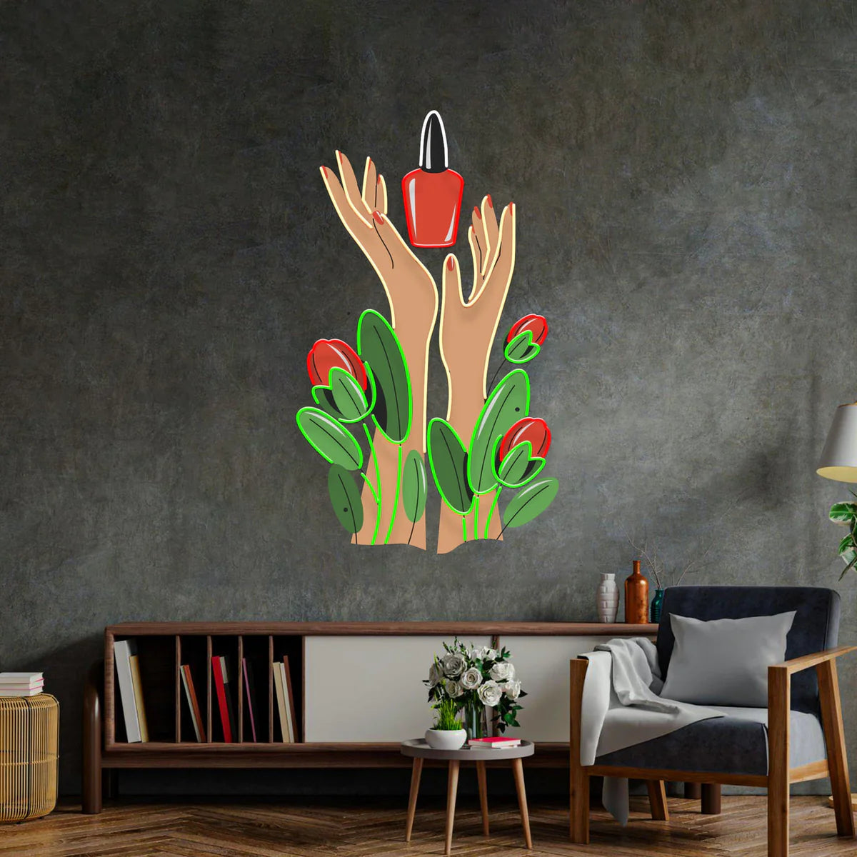 This elegant neon wall décor celebrates beauty and self-care, featuring graceful hands holding a nail polish bottle surrounded by blooming floral elements. Set against a textured grey wall, the warm skin tones, vibrant greens, and soft red accents glow beautifully, creating a calming yet stylish ambience. Ideal for salons, beauty studios, bedrooms, or creative spaces, this artwork adds a refined, feminine charm while symbolising creativity, care, and modern aesthetic expression.